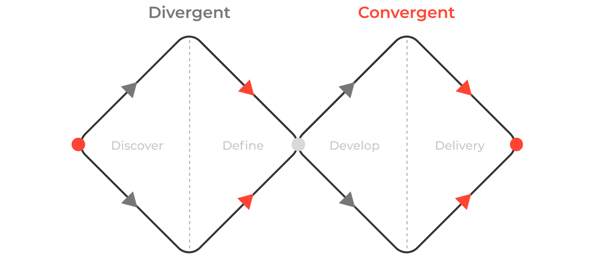 Divided into four well-defined phases (Discovery, Definition, Development, and Delivery), this approach guides us to explore the problem thoroughly before converging on a solution.